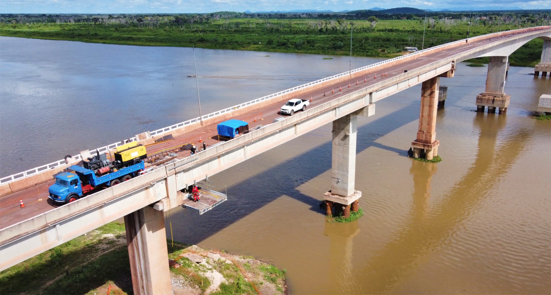 A montagem de uma plataforma suspensa, chamada de QuikDeck, embaixo do pilar 2 da ponte sobre o rio Paraguai na BR-262, que dá acesso a Corumbá, foi concluída hoje (27). Com o equipamento instalado será possível que os operários trabalhem sob a ponte permitindo a colocação de uma nova trama e placas de aço e concretagem. Além disso, o sistema, que foi trazido de fora do estado, é de última geração e garante que os reparos sejam executados com maior segurança e qualidade.